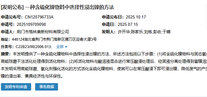 2025年10月17日,荊門市格林美新材料有限公司成功申請一項名為“一種含硫化鎳物料中選擇性浸出鎳的方法”專利,申請公布號為CN120796733A,申請日期為2025年7月15日。